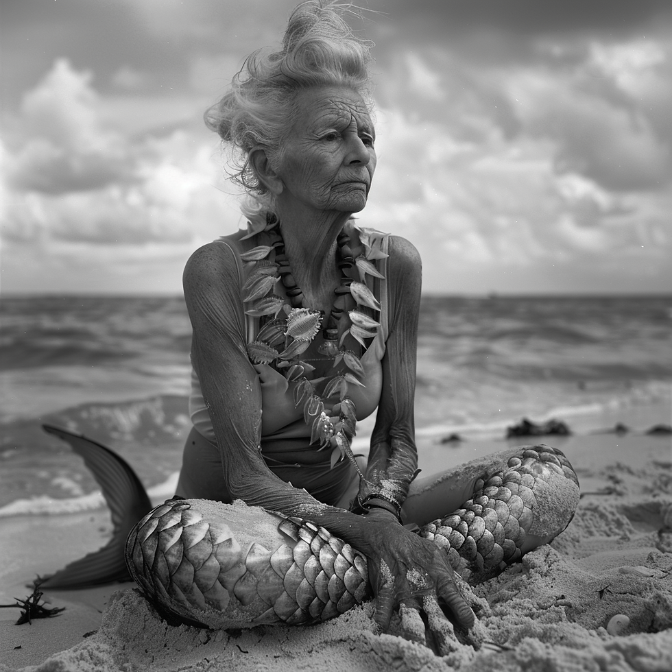 The old mermaid sits on the seashore and is sad about the unfulfilled princes. It seemed that there was still so much ahead, but youth was long ago washed away by the wave, and only memories and regrets remained.